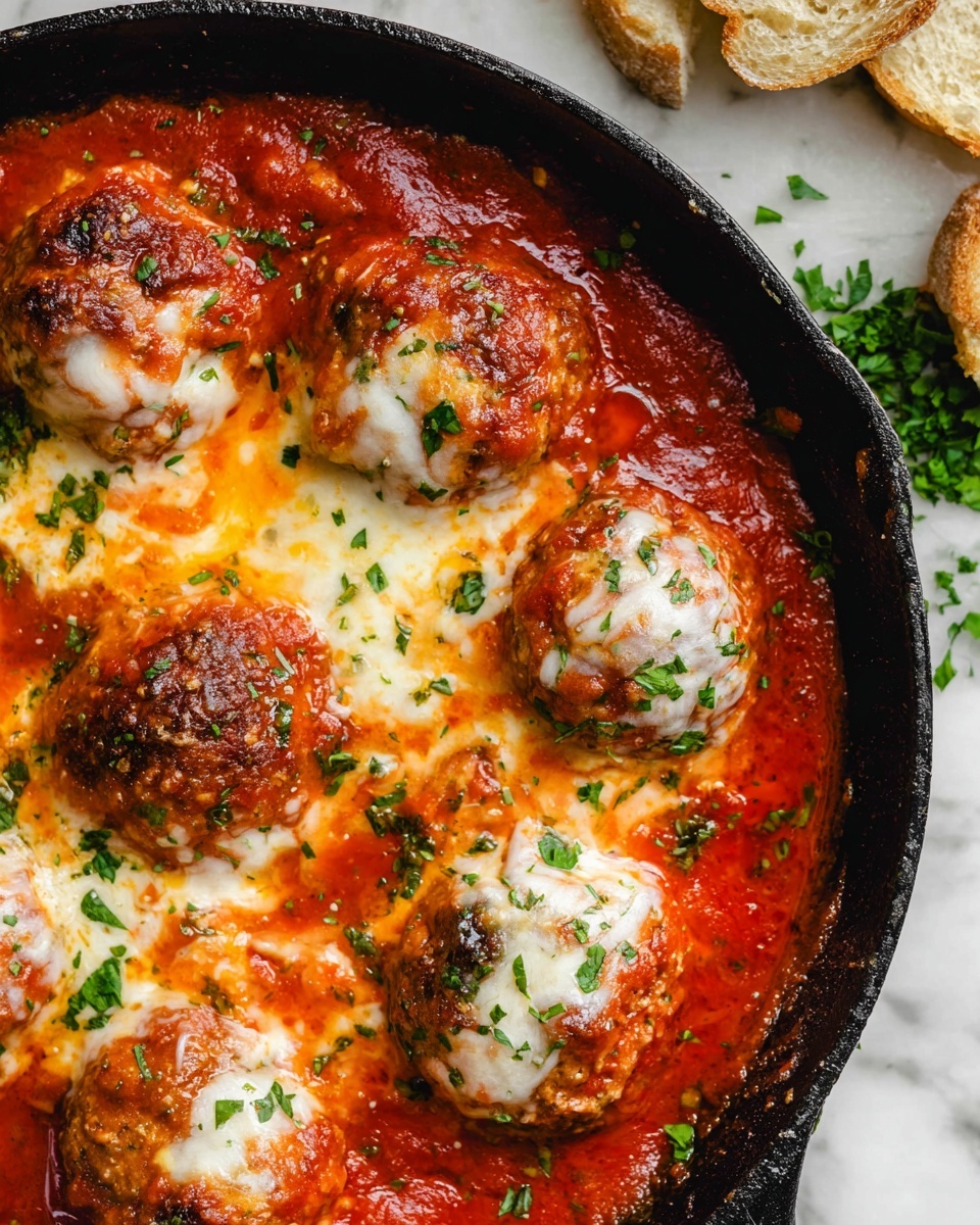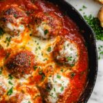 This Meatball Parmesan recipe is a hearty and festive dish perfect for Christmas dinner. Featuring a blend of lean ground beef and Italian pork, seasoned with Italian herbs and spices, these meatballs are baked to perfection and smothered in rich pasta sauce, then topped with melted mozzarella and Parmesan cheese. Garnished with fresh basil, this classic Italian-American comfort food brings together robust flavors and creamy textures in every bite.