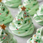 These Meringue Christmas Trees are a festive and light holiday treat made from fluffy whipped egg whites sweetened with sugar, flavored with vanilla, and tinted green with gel food coloring. Decorated with colorful sprinkles, they add a charming, snowy holiday touch to any dessert table.