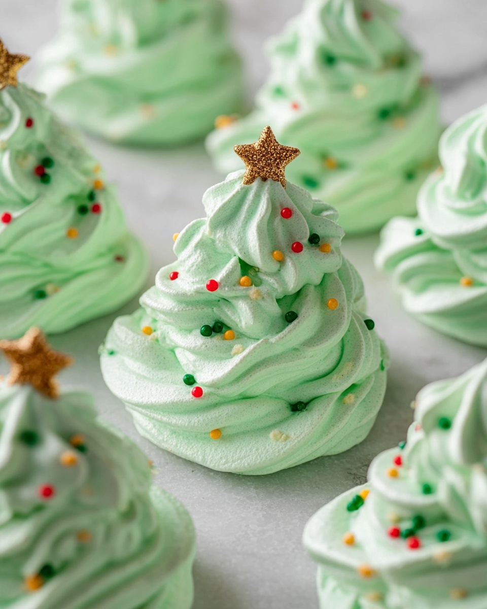 I love adding edible glitter or a light dusting of powdered sugar for a snowy effect. Sometimes, little flakes of crushed peppermint candy make a fun, festive crunch on top. These garnishes are simple but they take your Meringue Christmas Trees Recipe from cute to utterly charming.