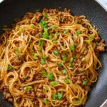 - Garnish and serve: Sprinkle the sliced green onions over the top as a fresh garnish. Serve the Mongolian ground beef noodles hot and enjoy.