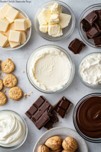 - Full fat cream cheese: The base for the cheesecake filling – bring to room temperature for smooth mixing.