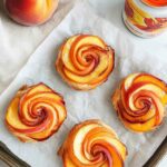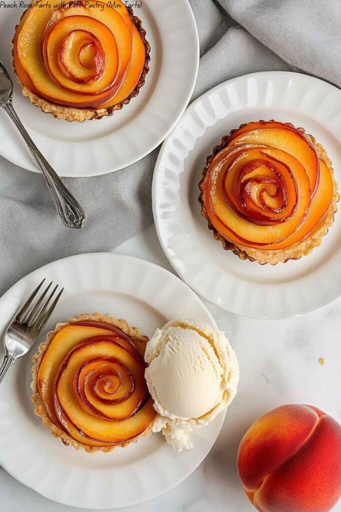 - Assemble Tarts: Roll out the puff pastry on a floured surface and cut into small squares. Place peach slices on each square and fold the edges to form a rose shape.