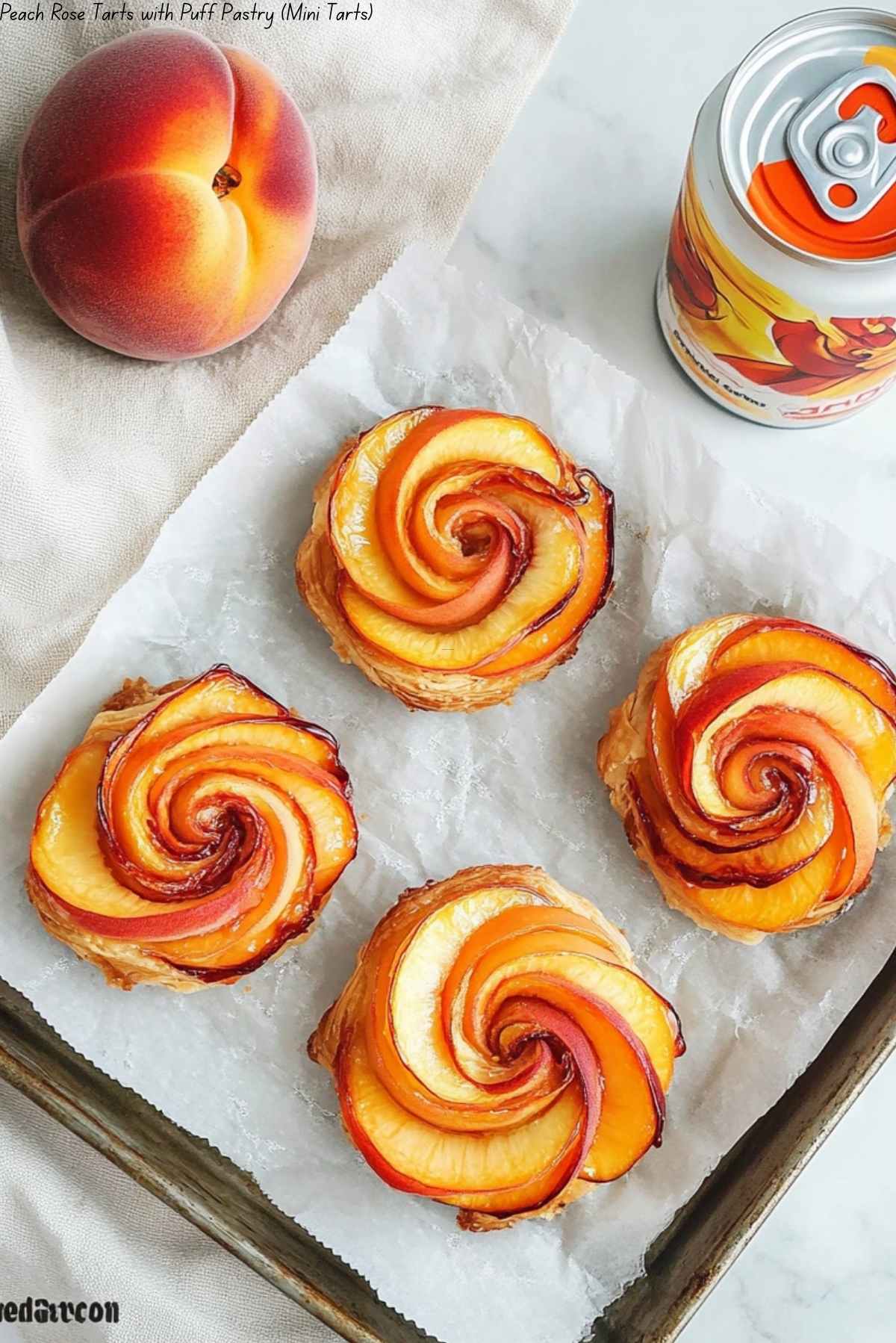 - Assemble Tarts: Roll out the puff pastry on a floured surface and cut into small squares. Place peach slices on each square and fold the edges to form a rose shape.