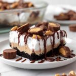 - Decorate (Optional): Garnish the top of your peanut butter lasagna with mini Reese’s cups, peanut butter chips, mini chocolate chips, a drizzle of melted peanut butter, and/or chocolate syrup as desired for added flavor and presentation.