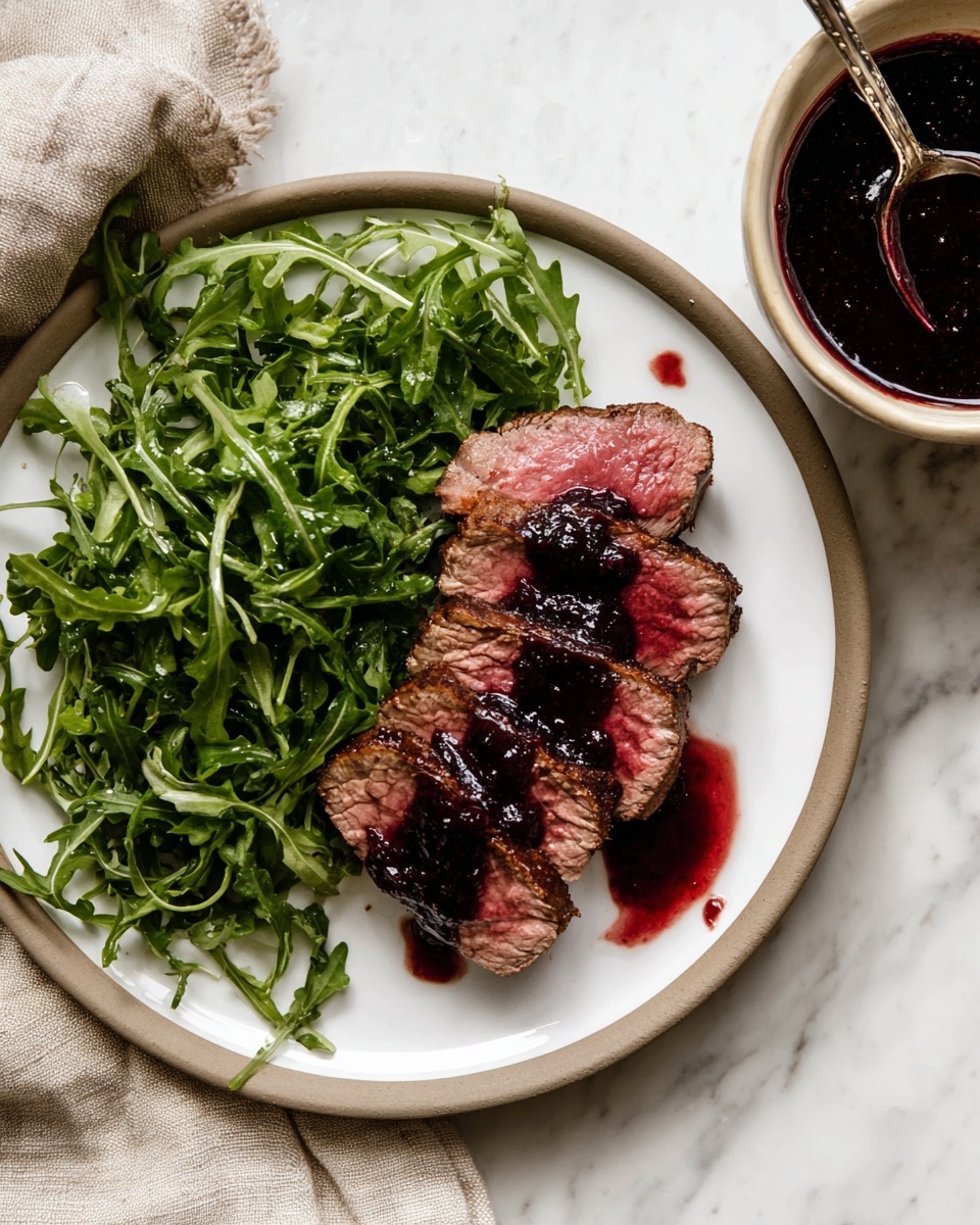 Classic roasted garlic mashed potatoes are my go-to with this tenderloin—the creaminess pairs perfectly with the peppery crust and cherry sauce. I’ve also enjoyed it alongside roasted root vegetables or a simple arugula salad with lemon vinaigrette for a lighter touch.