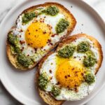For special occasions, I’ve served Pesto Eggs on Toast with Goat Cheese Recipe on a wooden board with a variety of fresh herbs scattered around and some edible flowers for color. Small ramekins of extra pesto and chili flakes allow guests to customize their bites, making it both beautiful and interactive.