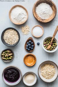 Keywords: Pistachio cookies, cardamom cookies, thumbprint cookies, chia jam, blueberry jam, gluten-free cookies, healthy cookies, oat flour cookies