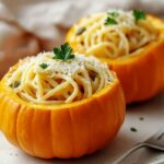 - Serve: Fill the roasted pumpkins with the pasta, garnish with parsley, pumpkin seeds, and extra Parmesan.