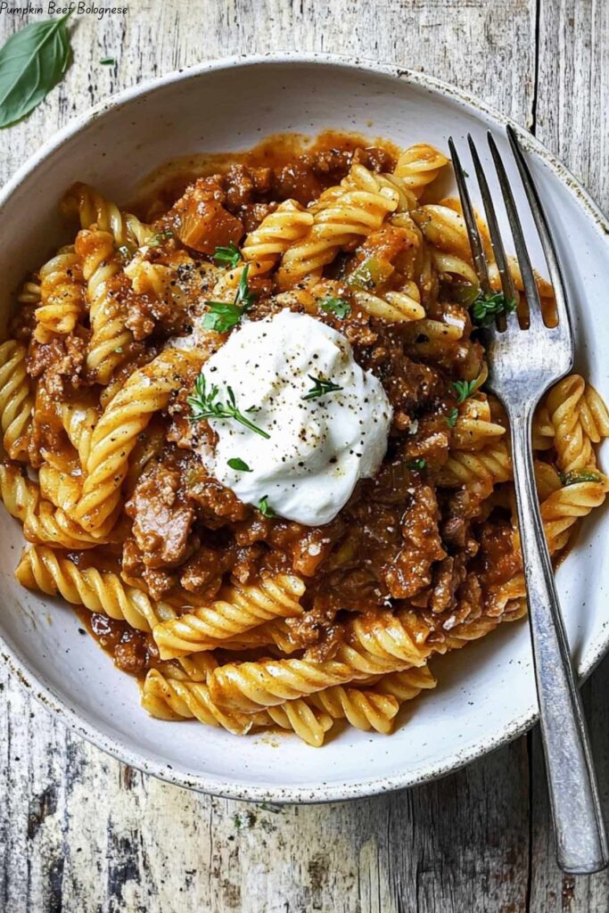 Keywords: pumpkin beef Bolognese, pasta recipe, savory sauce, hearty dinner, comfort food