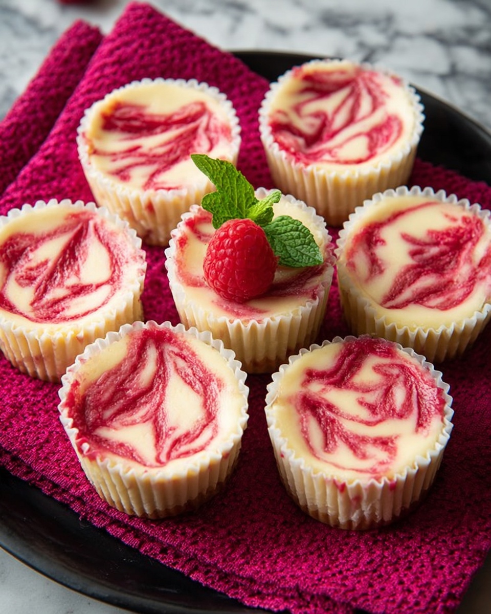 For special occasions, I’ve arranged these Raspberry Swirled Mini Cheesecakes on tiered dessert stands decorated with fresh berry clusters and edible flowers—it’s stunning and makes the dessert table pop. Another fun idea is to serve them in pretty cupcake liners that match your event theme. You could even drizzle a bit of white chocolate over the tops for an extra touch of elegance.