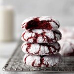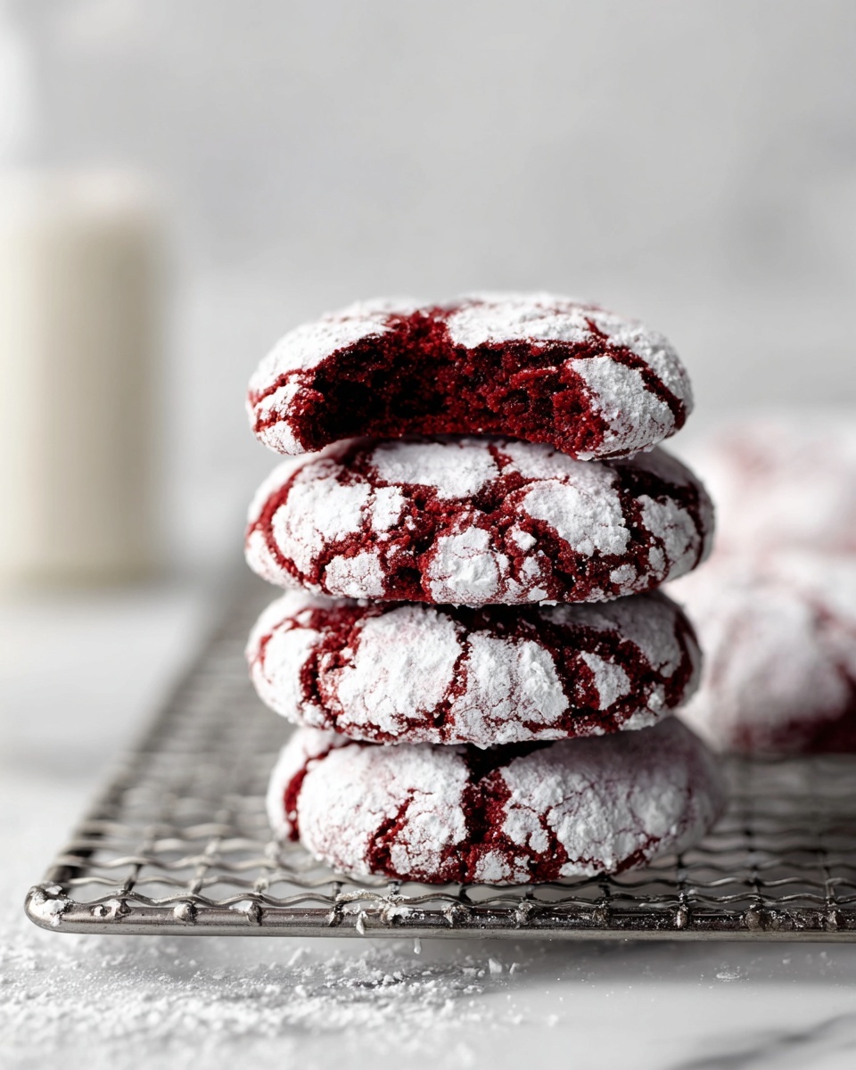 Once out of the oven, let your cookies cool on the pan for a few minutes before transferring them to a wire rack. This prevents breakage and helps them finish setting up. Now, grab that glass of milk you’ve been dreaming about—this Red Velvet Crinkle Cookies Recipe is best enjoyed fresh and a little warm!