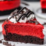 Indulge in the perfect combination of red velvet and Oreo flavors with this decadent Red Velvet Oreo Cheesecake. A rich and creamy red velvet cheesecake sits atop a crunchy Oreo cookie crust, garnished with melted dark chocolate and whipped cream.