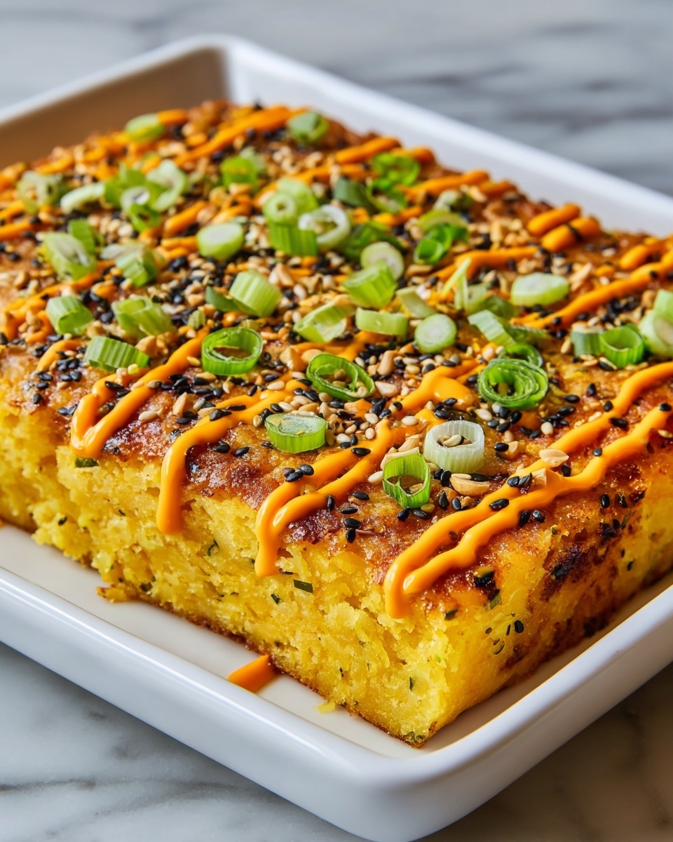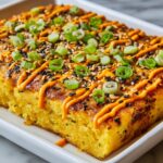 - Garnish and Serve: Remove the sushi bake from the oven. Drizzle unagi sauce and spicy mayo (made with mayonnaise, sriracha, and lime juice) across the top. Sprinkle with sesame seeds, green onions, and roasted seaweed pieces. Serve slices topped with fresh cucumber and avocado for a vibrant finish.