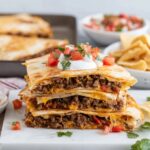 For parties, I like to slice the sheet pan taco into bite-sized squares and serve them on a big platter with various toppings so guests can customize. Another fun idea is to serve these squares alongside mini bowls of guacamole, shredded lettuce, and jalapeño slices for an interactive taco bar.