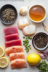 Whether you’re serving it as an appetizer for a special meal or a light main course on a warm day, this recipe is worth trying because it’s all about quality ingredients shining through. Plus, the balance of silky tuna, buttery salmon, and sweet scallops combined with zesty brightness will keep your taste buds intrigued and happy.