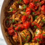 Next, add the minced garlic and sliced onion right on top of the chicken. Pour over the canned diced tomatoes with their juice, balsamic vinegar, and chicken stock. This combo is the magic sauce that bathes the chicken as it cooks, making it juicy and aromatic. I use a spoon to gently mix the liquids around so everything’s evenly distributed but be careful not to disturb the chicken too much.