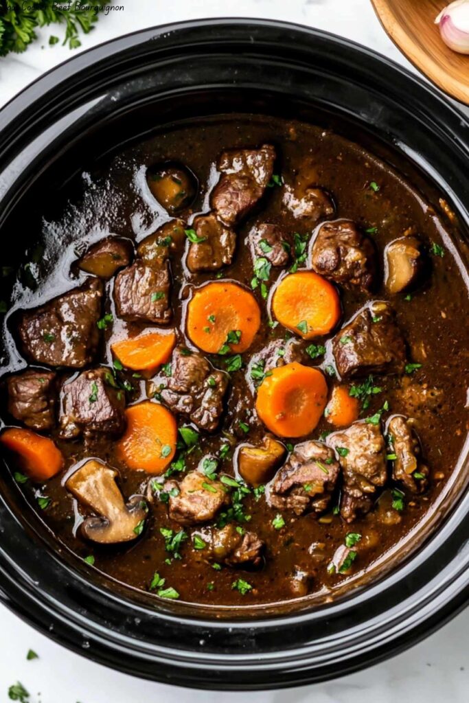 Keywords: Slow Cooker Recipe, Beef Bourguignon, Comfort Food, French Cuisine