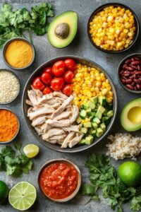 Spoon cooked rice into bowls, then layer on the shredded chicken mixture, frozen corn (I briefly microwave it to thaw), drained black beans, diced avocado, and chopped cilantro. Don’t forget a squeeze of fresh lime and a little extra drizzle of cilantro lime dressing if you want that creamy finish!
