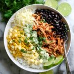 Spoon cooked rice into bowls, then layer on the shredded chicken mixture, frozen corn (I briefly microwave it to thaw), drained black beans, diced avocado, and chopped cilantro. Don’t forget a squeeze of fresh lime and a little extra drizzle of cilantro lime dressing if you want that creamy finish!