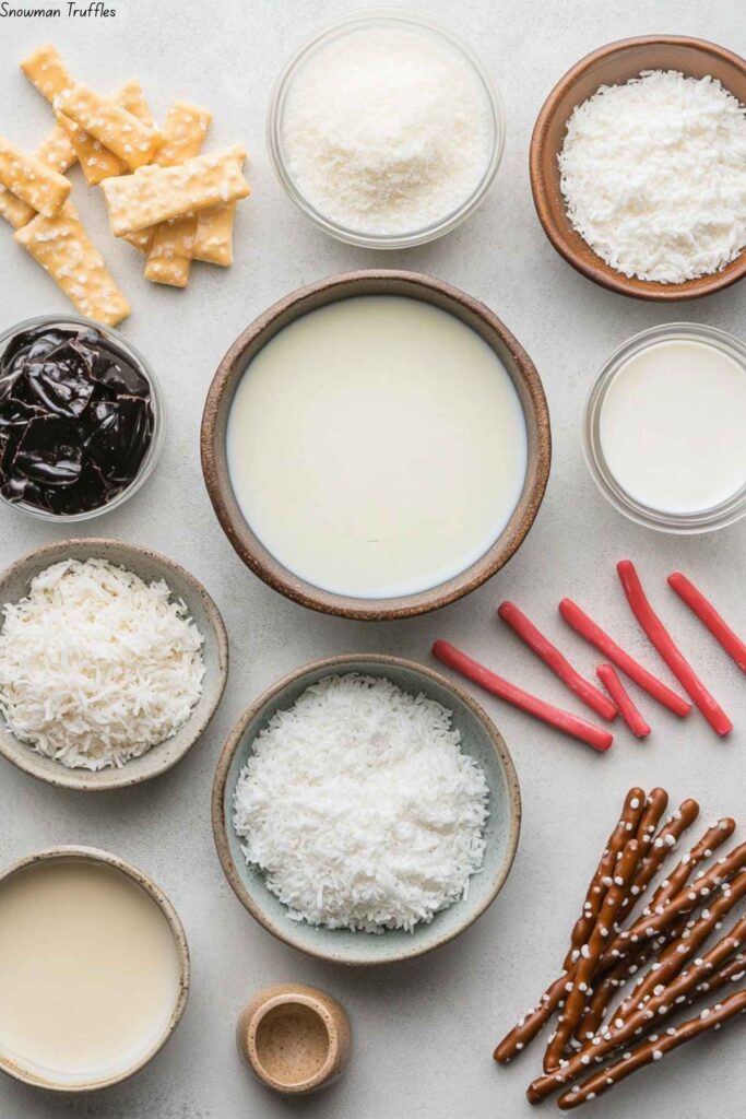 - Insert a thin pretzel stick into each coconut ball to create the snowmen’s arms.