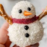- Insert a thin pretzel stick into each coconut ball to create the snowmen’s arms.