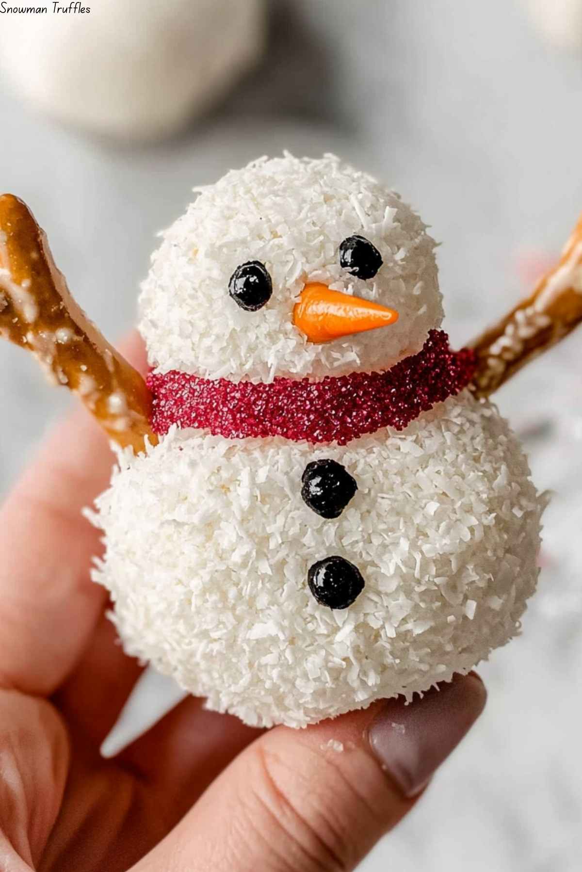 - Decorate the Snowmen: Dip each truffle in melted white chocolate, then add black and orange icing for eyes, nose, and mouth. Insert pretzel sticks for arms and red candy straps for scarves. Let the decorations set before serving.