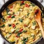 This Spaghetti Squash Cacio e Pepe recipe is a delicious, low-carb twist on the classic Italian dish, featuring tender spaghetti squash strands coated in a creamy Parmesan and pepper sauce with sautéed chicken, sun-dried tomatoes, garlic, and spinach. It’s a flavorful, hearty meal perfect for a weeknight dinner.