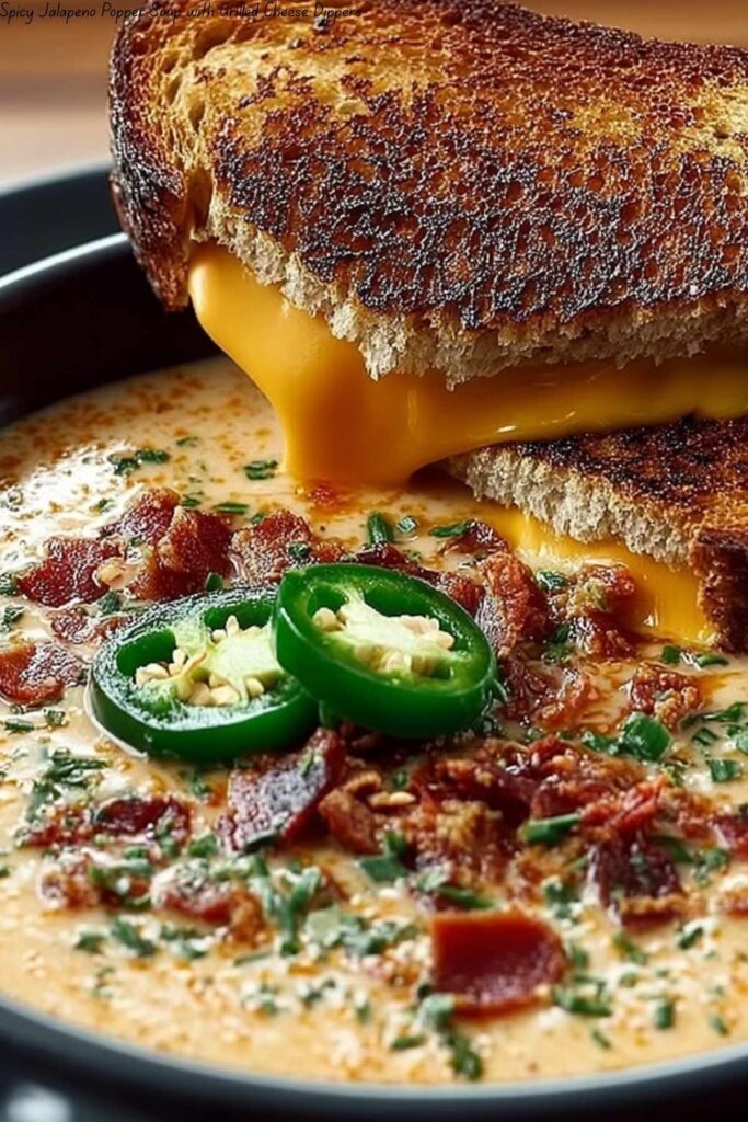 This Spicy Jalapeño Popper Soup with Grilled Cheese Dippers is a creamy and flavorful soup with a kick of heat from jalapeños, topped with crispy bacon and served with gooey grilled cheese dippers for the perfect comfort meal.