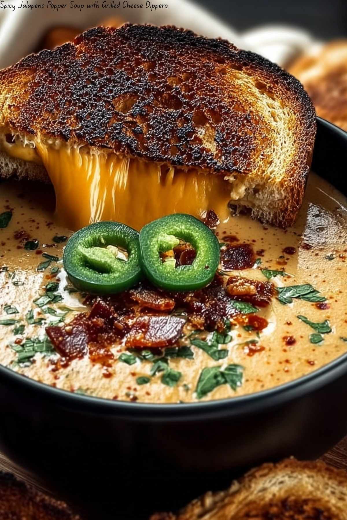 This Spicy Jalapeño Popper Soup with Grilled Cheese Dippers is a creamy and flavorful soup with a kick of heat from jalapeños, topped with crispy bacon and served with gooey grilled cheese dippers for the perfect comfort meal.