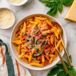This Spicy Pasta Arrabbiata is a fiery Italian classic featuring a robust tomato sauce with garlic, cayenne chili, and red pepper flakes, perfectly tossed with al dente pasta and garnished with fresh basil and Parmesan cheese. It’s quick to prepare, packed with flavor, and ideal for a comforting weeknight meal.