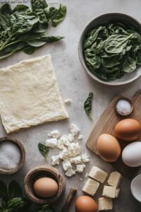 - Mix the Filling: In a bowl, combine the chopped fresh spinach, crumbled feta cheese, grated Parmesan cheese, and season with salt and pepper to taste. Mix gently to combine all ingredients evenly.