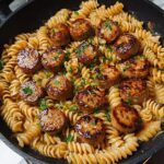 This Sticky Honey Garlic Sausage Pasta Skillet is a delicious and easy one-pan meal that combines savory sausage with a luscious honey garlic sauce, all tossed with perfectly cooked pasta. It’s a quick and flavorful dinner option, featuring a sticky, sweet-savory glaze that coats tender pasta and crispy sausage slices, finished with fresh parsley and optional Parmesan cheese for an extra burst of flavor.