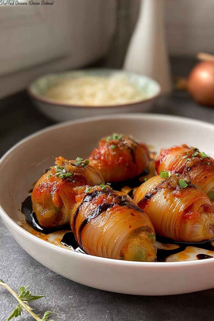 Keywords: Stuffed Onions, Onion Dolma, Mediterranean recipe, Baked onions, Savory filling, Tomato sauce