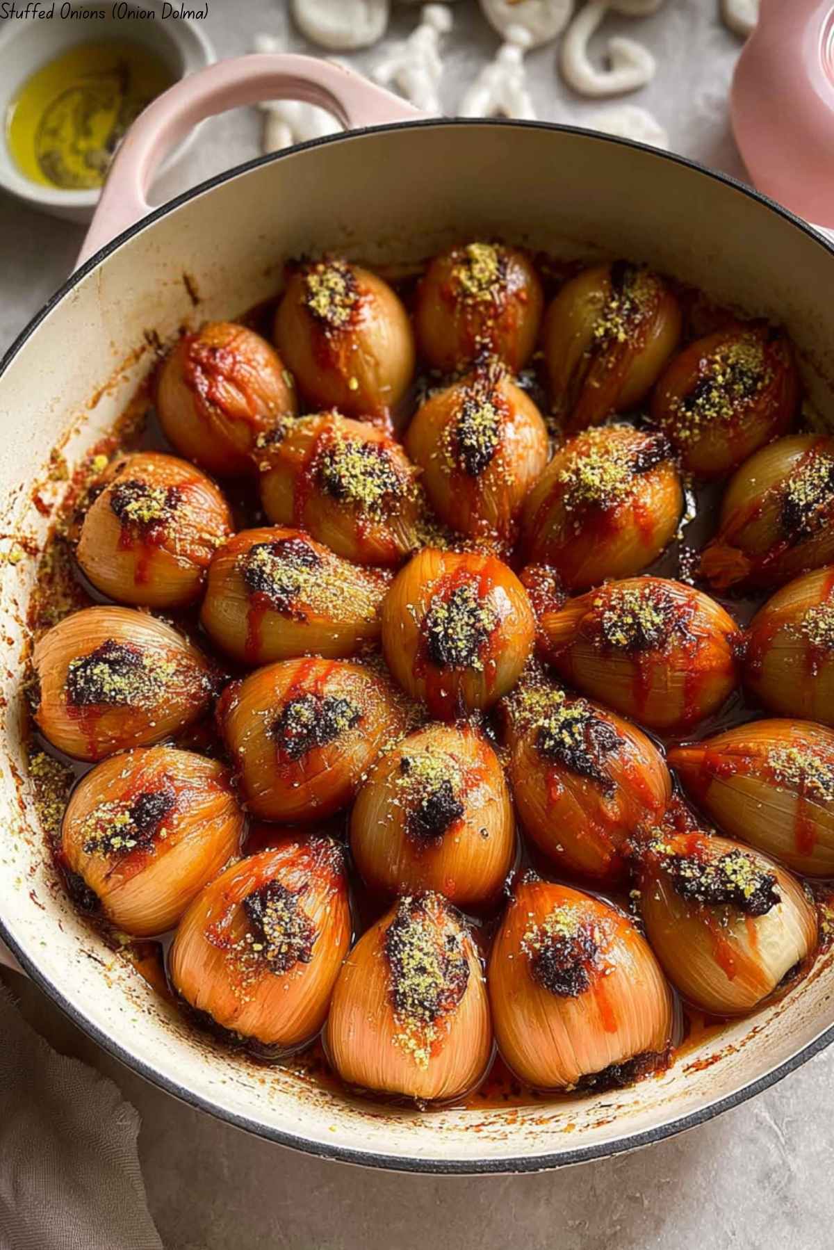 Keywords: Stuffed Onions, Onion Dolma, Mediterranean recipe, Baked onions, Savory filling, Tomato sauce