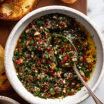 This Sun-Dried Tomato Olive Oil Bread Dip is a flavorful and vibrant Mediterranean-inspired appetizer perfect for serving alongside crusty bread. Combining rich extra virgin olive oil with savory sun-dried tomatoes, briny castelvetrano olives, fresh herbs, and a touch of balsamic vinegar, this dip is enhanced by the pungent garlic and shallots, creating a deliciously aromatic and addictive spread for any gathering or snack time.