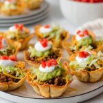 Once your wonton cups are golden and the beef is ready, spoon about 1 tablespoon of the meat mixture into each cup. Top each with about a tablespoon of shredded fiesta blend cheese while the meat is still warm, so it melts deliciously. Then add shredded lettuce, a spoonful of guacamole, a dollop of sour cream, and finish off with a little pico de gallo on top. This layering creates such a nice balance of textures and flavors with every single bite.