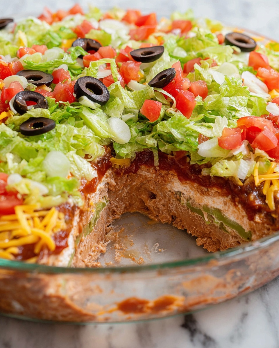 A flavorful and colorful 7-layer festive dip perfect for parties and gatherings, combining layers of refried beans, creamy guacamole, sour cream seasoned with taco spices, chunky salsa, crisp lettuce, shredded cheese, olives, tomatoes, and green onions for a crowd-pleasing appetizer.