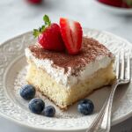- Add toppings and serve: Before serving, spread whipped cream over the soaked cake, dust lightly with cocoa powder, and garnish with fresh mixed berries to enhance flavor and presentation.