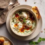 Turkish Eggs with Creamy Yogurt & Butter Sauce is a traditional Turkish breakfast dish featuring perfectly poached eggs nestled on a bed of herbed yogurt and topped with a warm, spiced butter sauce. The dish combines silky Greek yogurt infused with fresh herbs and garlic, tender poached eggs, and a buttery Aleppo pepper sauce, served alongside crusty bread for a comforting and flavorful meal.