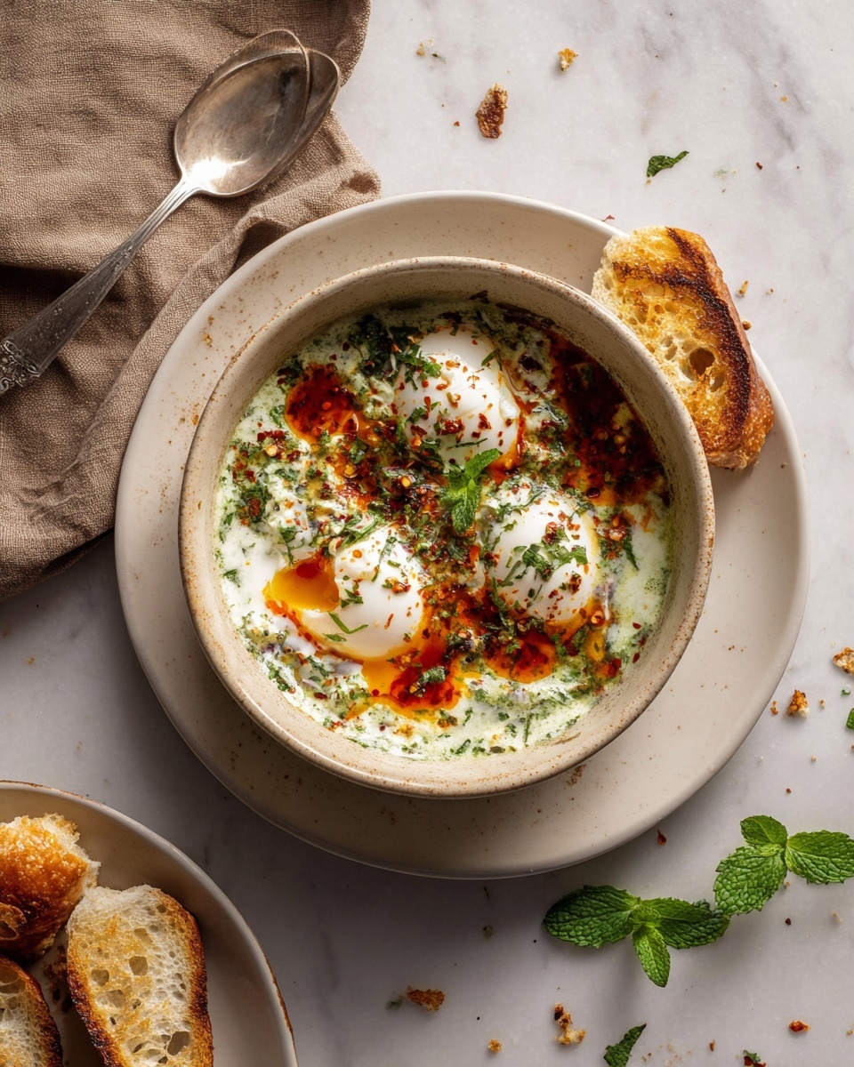 Spread the herbed yogurt thickly on your serving plate, then nestle the poached eggs gently on top. Drizzle the hot spicy butter sauce generously over the eggs. Finish with a sprinkle of flaky sea salt and some freshly cracked black pepper. Serve immediately with warm pita or crusty bread—you’ll want to soak up every drop!