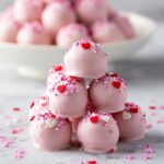 Keywords: Valentine’s Day dessert, Oreo truffles, no bake dessert, pink truffles, Valentine’s treats, no cook dessert, cream cheese truffles
