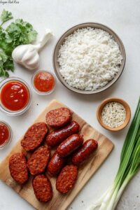 A flavorful and hearty vegan red rice dish combining cooked red rice with savory vegan sausage, tomato paste, and a kick of hot sauce for a spicy, satisfying meal perfect for any occasion.