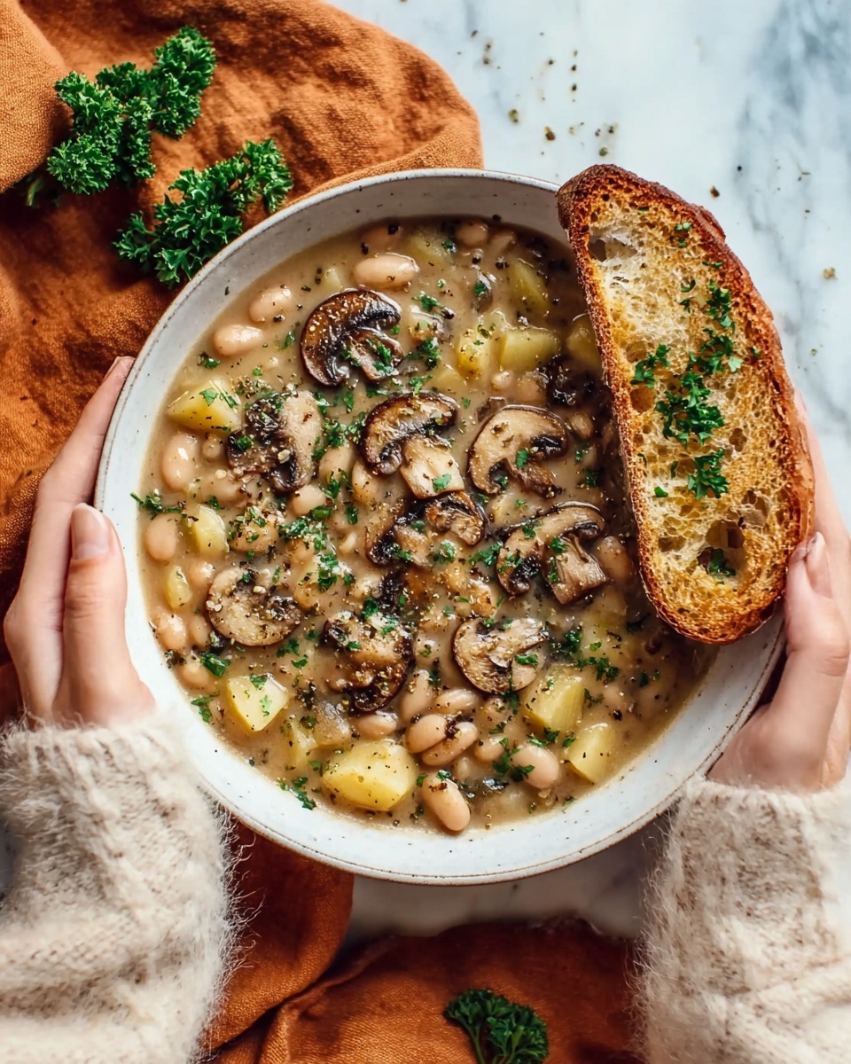 Keywords: vegan stew, white bean mushroom stew, plant-based recipe, dairy-free soup, easy vegan dinner, mushroom stew, gluten-free vegan