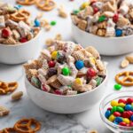 - Prepare the Snack Mix: In a large mixing bowl, combine 2 cups Corn CHEX cereal, 2 cups Cheerios cereal, 2 cups mini pretzel twists, 1 cup dry roasted salted peanuts, and 2 cups regular M&M’s candies. Gently mix them together to evenly distribute all ingredients.
