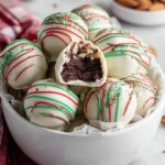 To finish that Winter Wonderland look, melt your red and green candy melts and decorate the truffles with pretty swirls or dots. I find that melting these in small portions at a low temperature gives me better control. If you want a polished look, you can pipe thin lines using a small plastic bag with the corner cut off. Let the candy melts set completely before packing or serving.